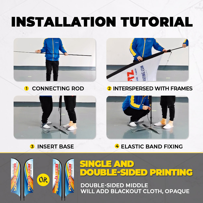 Traditionally, when you need double-sided flags, your logo needs to be printed on two separate flags and then sew them together back-to-back. And a blackout cloth would usually be inserted in case the logos on the front side and back side will affect each other , the standard fabric 110g polyester, single-sided and double-sided printing use it , it is Good penetration & wear resistance and Good for both indoor and outdoor uses .