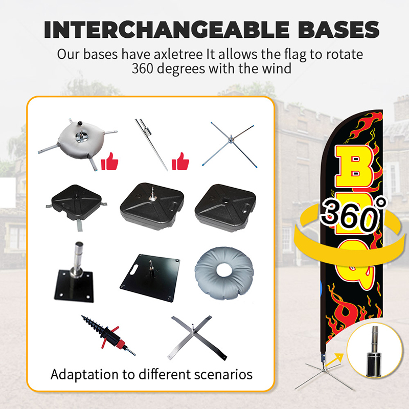 We provide different hardware and accessories. A cross base is perfect for any flat surface, it can be used with our water base to add extra support. And the ground spike can be used in grass or soil to add stability to your display flags. You can pick any one of them to install the custom feather flag with absolute balance and strength. Besides the packages, you can also purchase the hardware individually on their pages.
